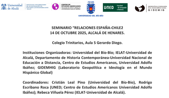El IELAT se complace en invitarle al Seminario “Relaciones España-Chile”. El evento se celebrará de manera presencial el 14 de octubre a las 10:00 (horario peninsular) y tendrá lugar en , Aula 4 del Colegio de Málaga de la Universidad de Alcalá. Se adjunta programación completa del evento.