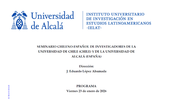 El IELAT se complace en invitarle al «Seminario Chileno-Español de investigación«, que se llevará a cabo el 23 de enero de 2026 desde las 9:30 (horario peninsular), en el en la Facultad de Derecho de la Universidad de Alcalá.